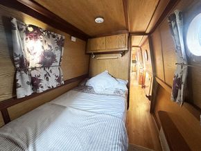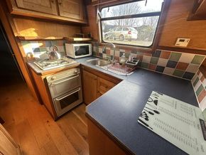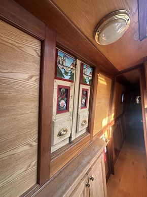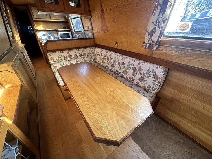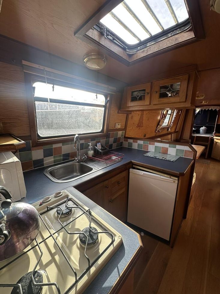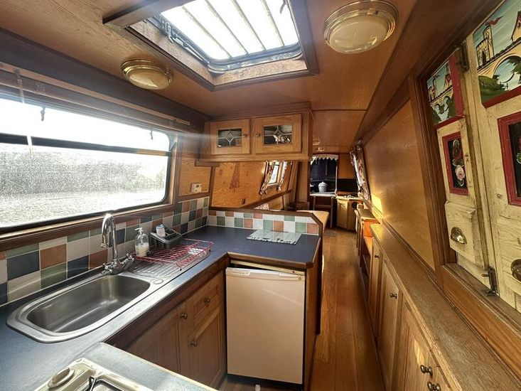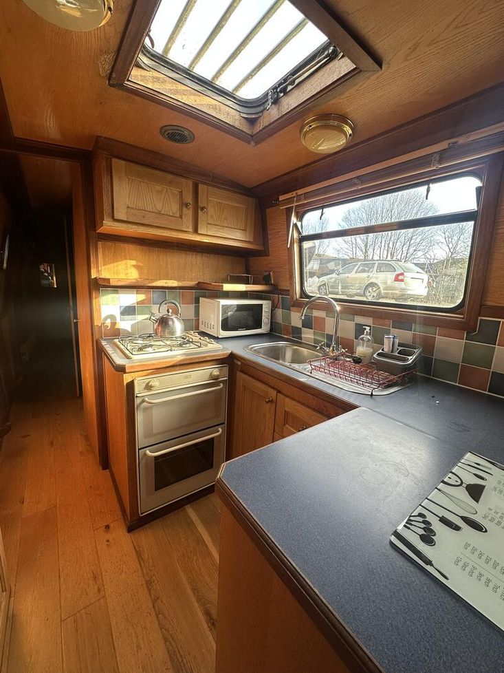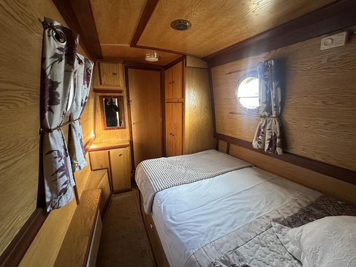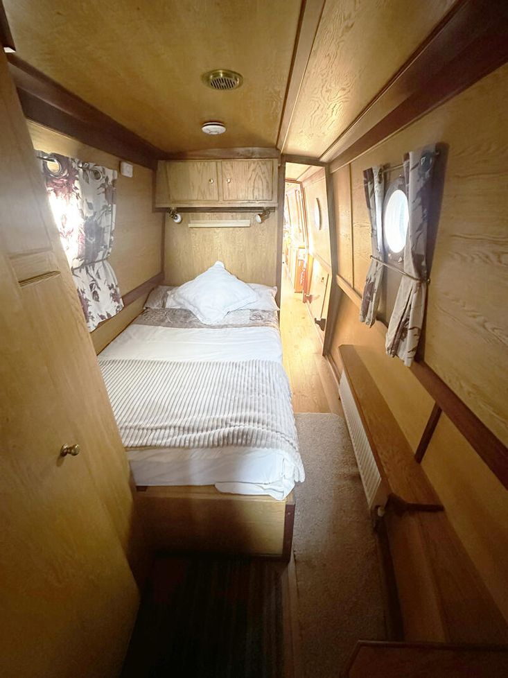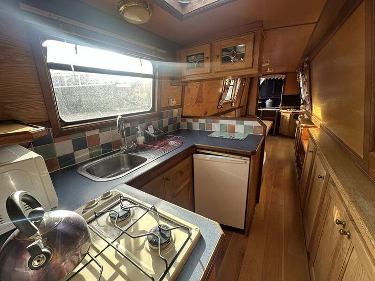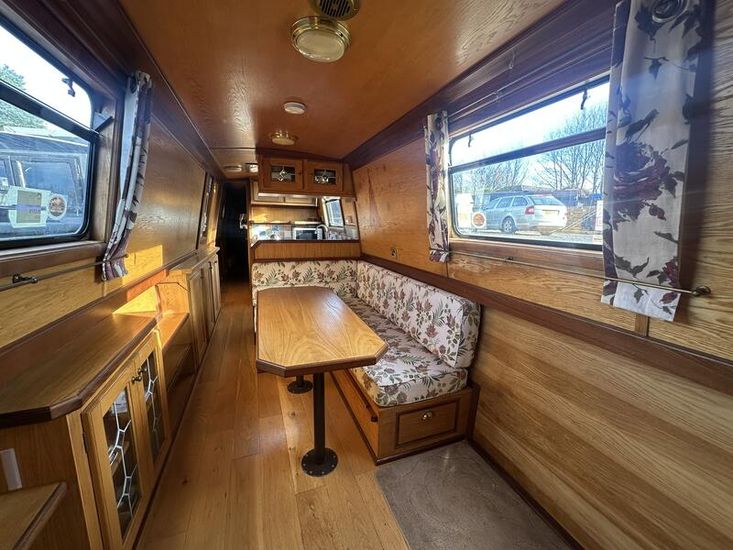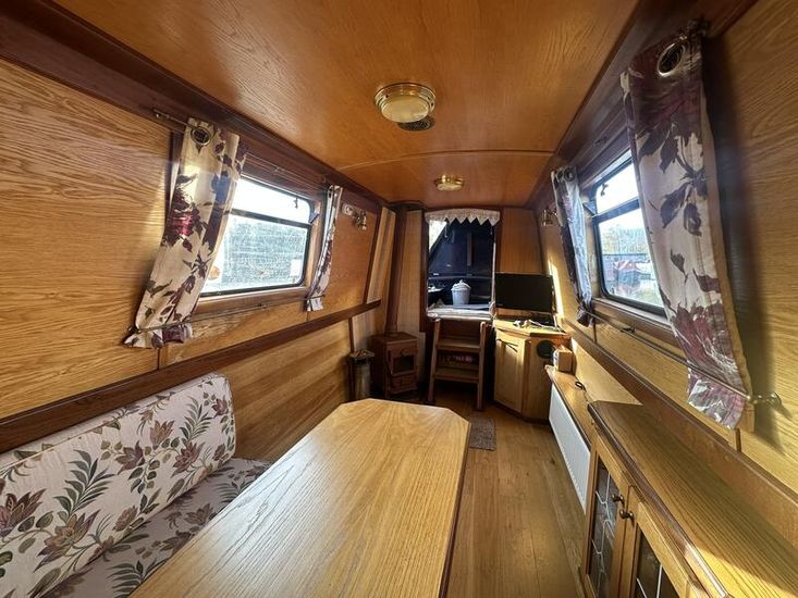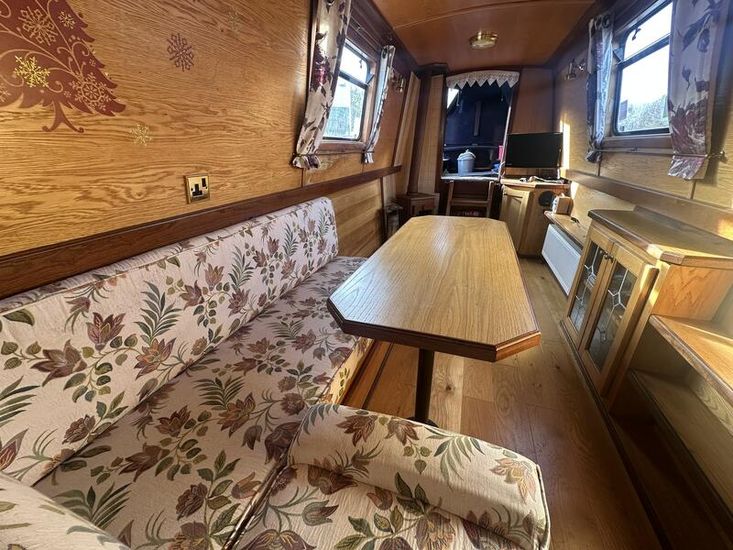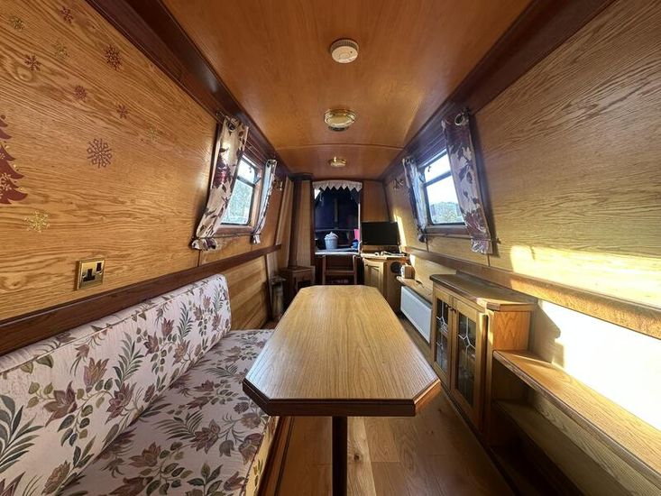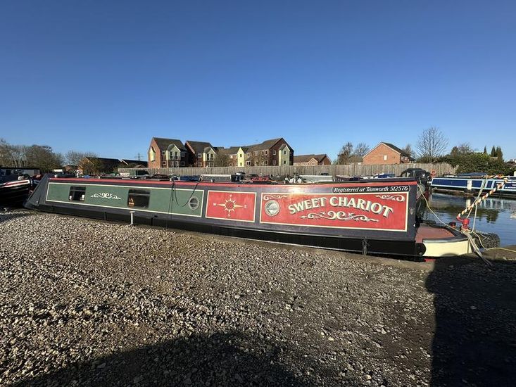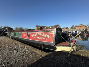 Sweet Chariot is a 54ft traditional-stern narrowboat built in 2005 by SM Hudson Boatbuilders, known for their distinctive steelwork and traditional layouts. The vessel provides two permanent berths, with an additional make-up double in the saloon for flexible accommodation. The interior is fitted in oak panelling with sapele hardwood trim, giving a consistent and hard-wearing finish throughout.