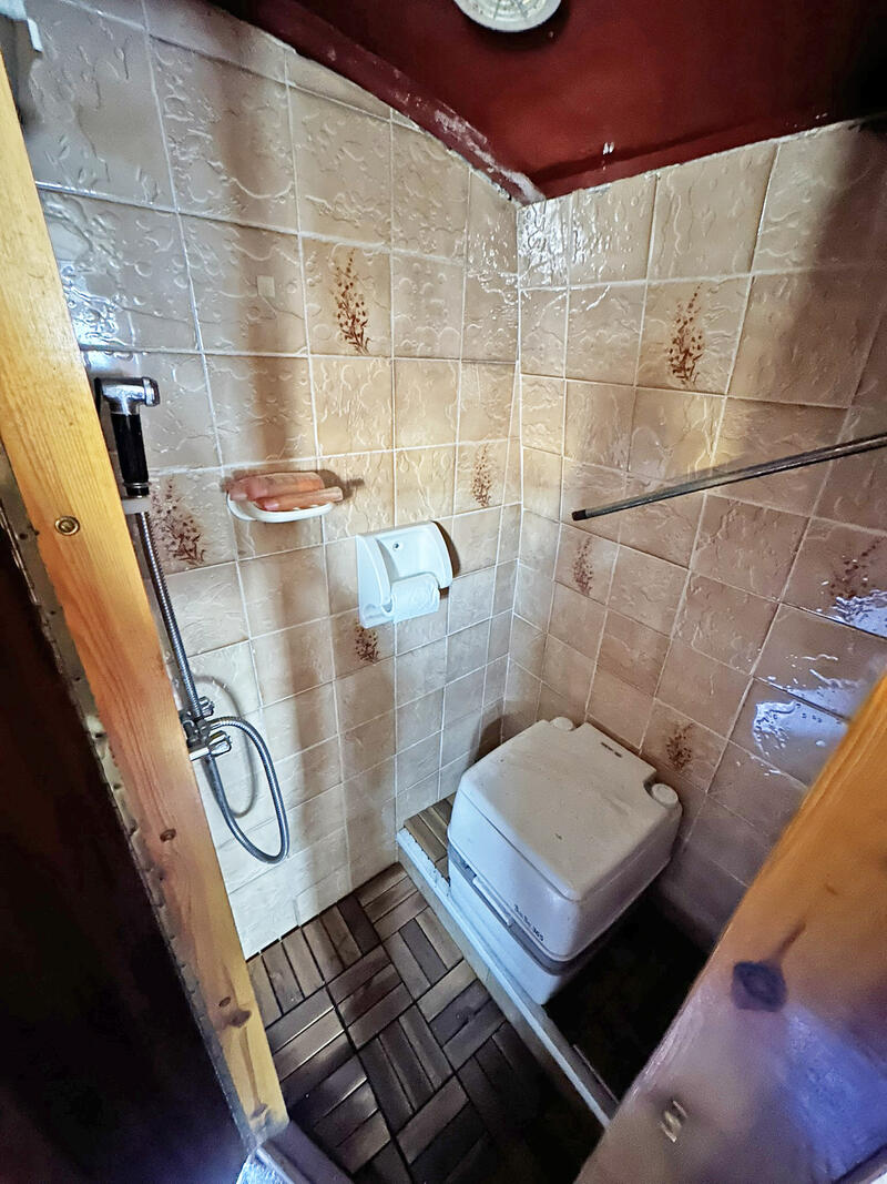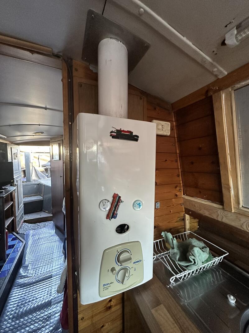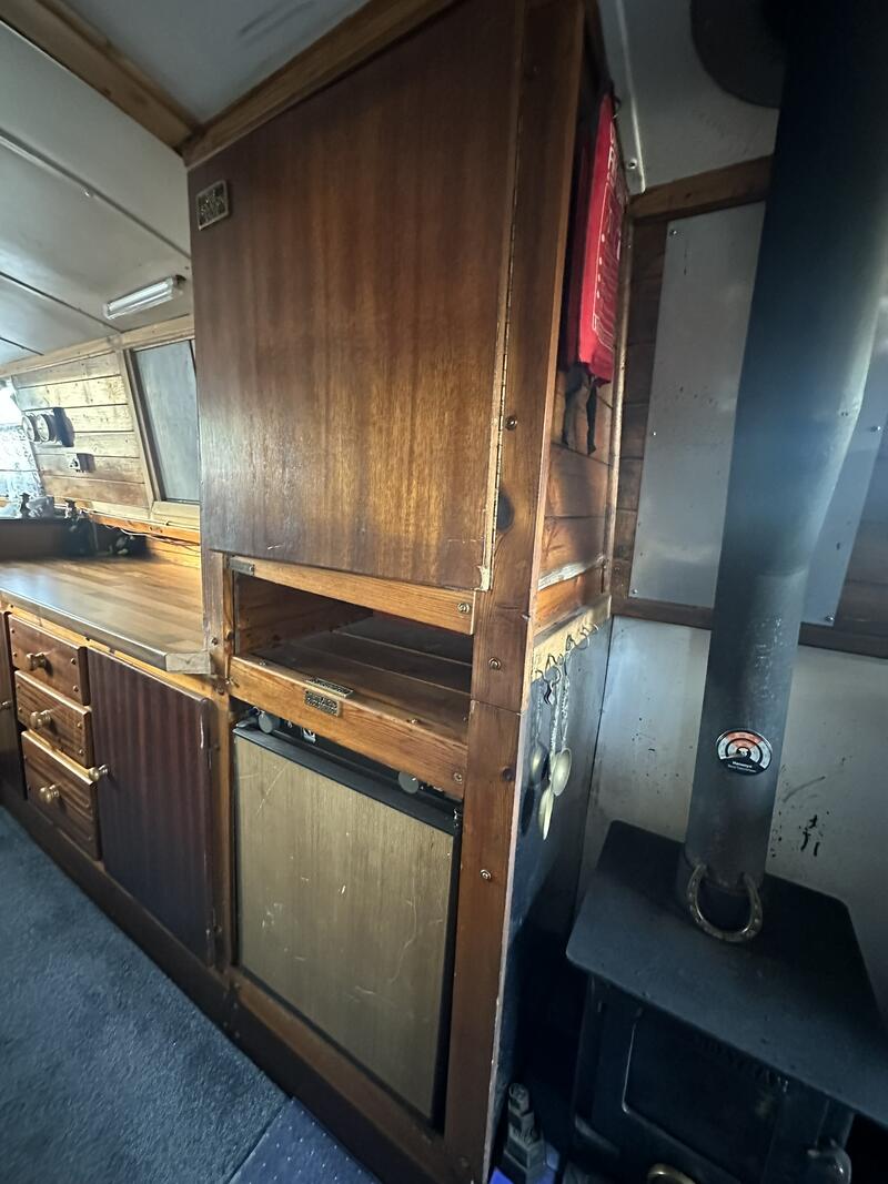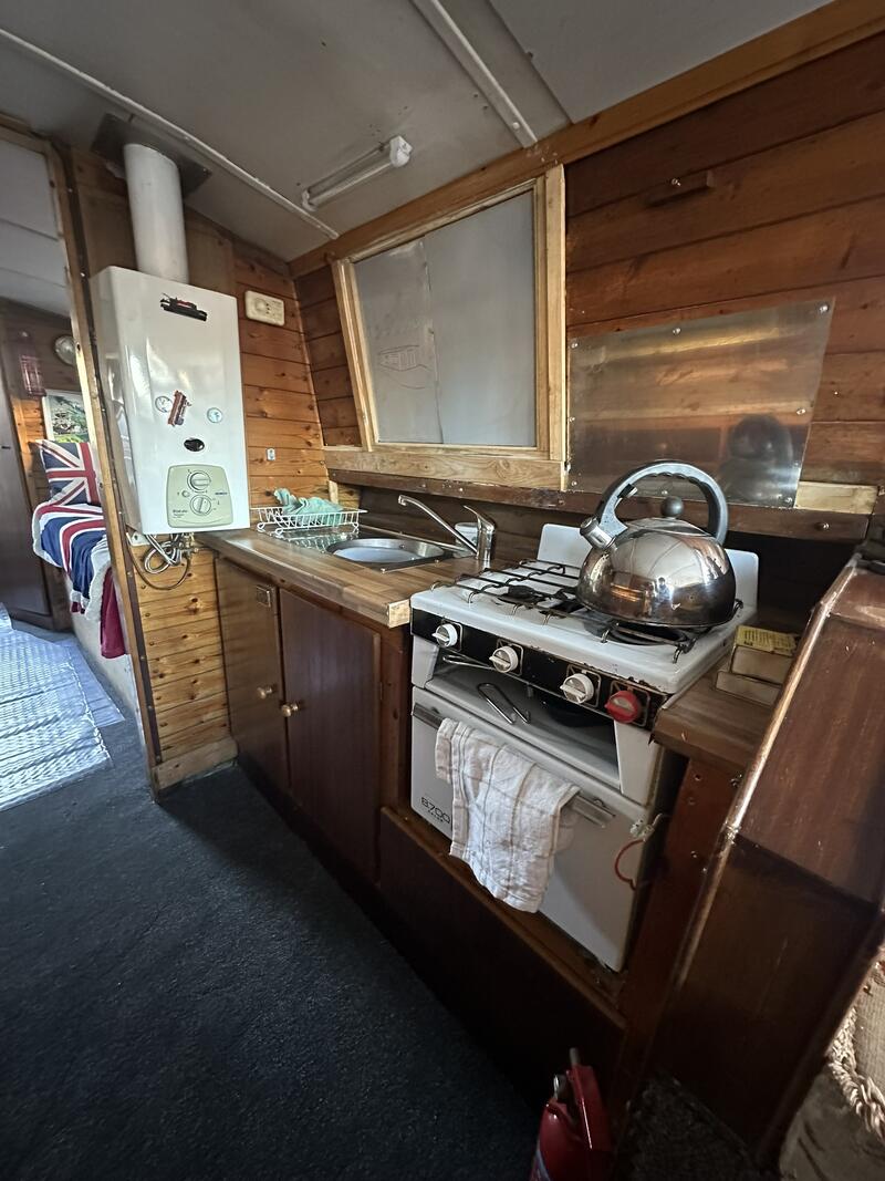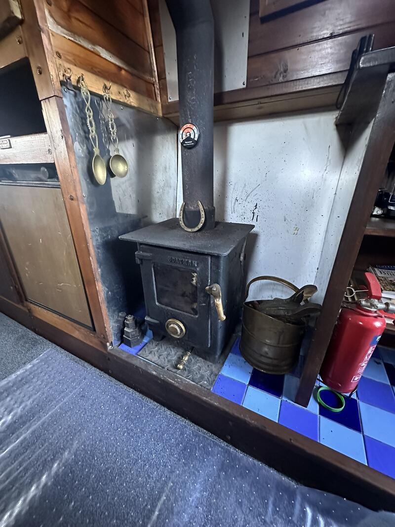 Inside, the layout is compact but well arranged. There is a single fixed berth, plus a make-up double in the saloon. The boat has a separate shower room, and a full-sized galley equipped with standard appliances. Heating is provided by a Boatman solid fuel stove.
